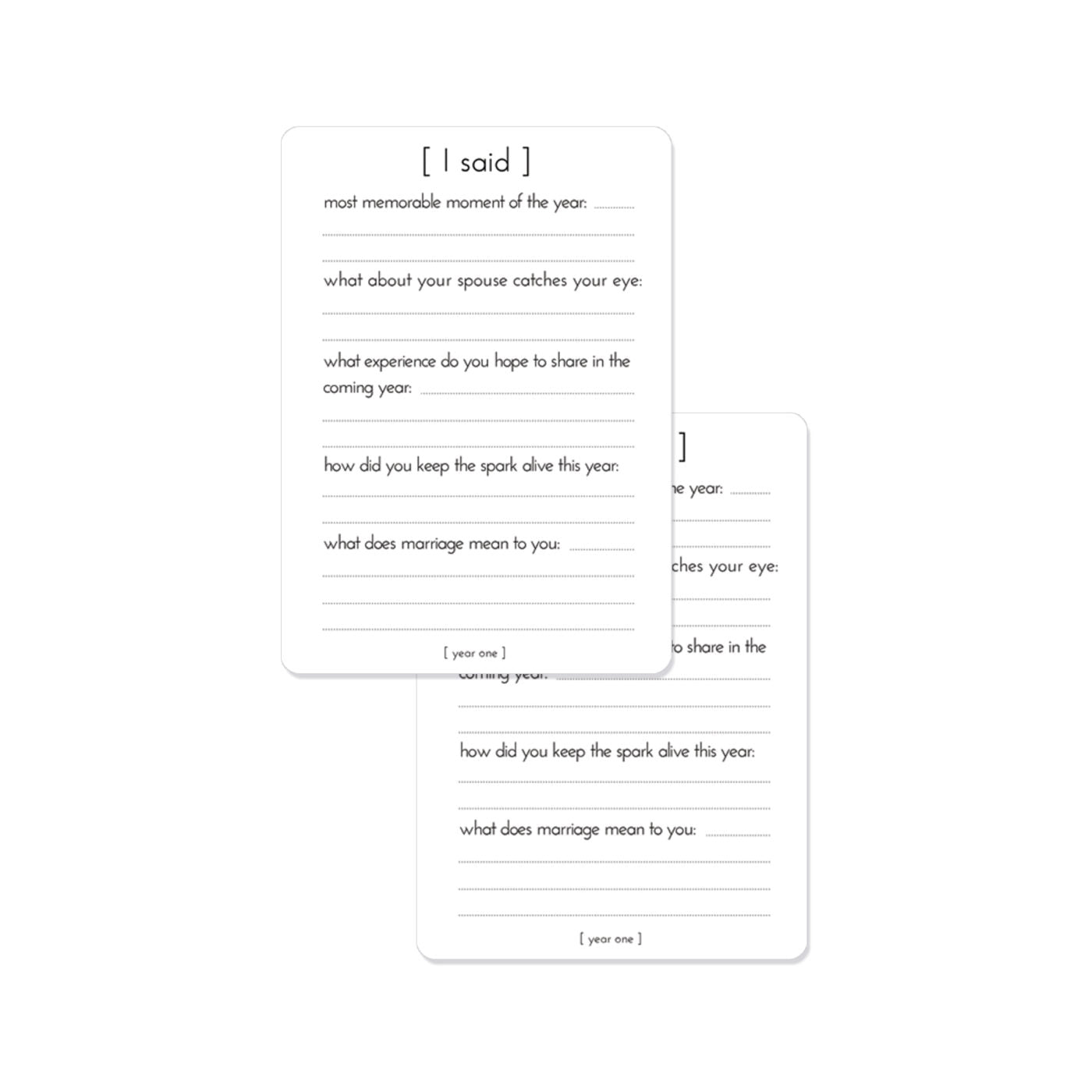 anniversaries documents your love story with a picture from your anniversary day and space to write how you celebrated each other. each anniversary year also includes an “I said” “You said” page with prompted writing to record the couple’s reflections on marriage from the past year and hopes for the coming future.